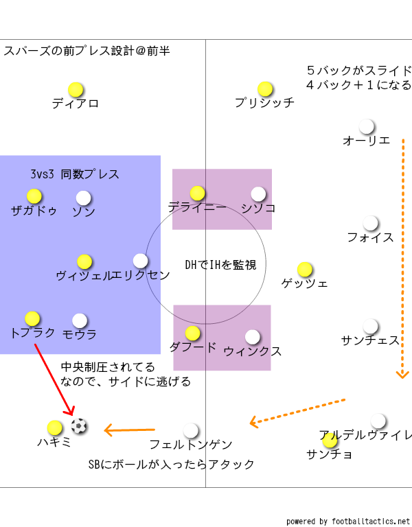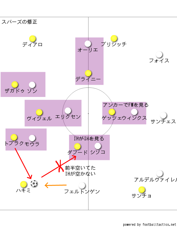 ハキミのミスである。が、スパーズの中盤を5枚にしたことで、