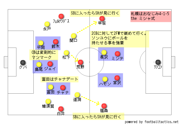 さて、ク・ソンユンに持たされたくない札幌は2CB化さら3CBに変更。この3CB化面白いのは早坂,福森はやっぱりSB化する。