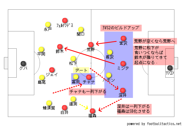 兵藤が前線に上がって4-3-3を作る。そして、3バックに対して3枚でビルドアップを阻止する。