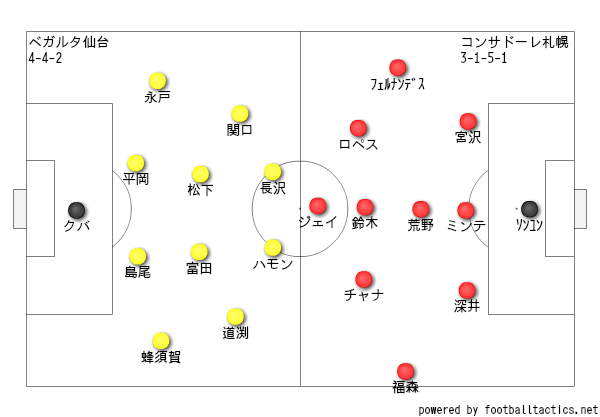 この札幌に対して仙台はFWの2枚とチャナとデートする富田で中央を閉鎖し、サイドに誘導する事に成功。