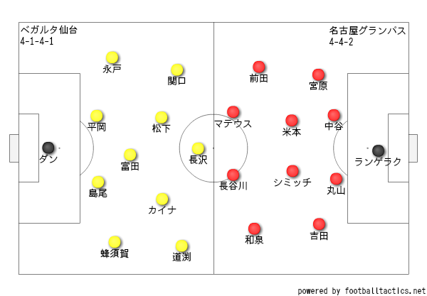 仙台は、山雅戦とは違い5バックにはせず4-4-2のまま。キャラクタを変える。