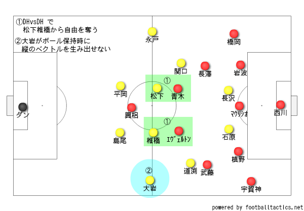 30分くらいから仙台は前プレスで嵌めるのを諦める。相手の3バック化に対して仙台の前プレスが整理されておらず、無理に前プレスにいったところ剥がされボールを簡単に進められていたためだと思う。