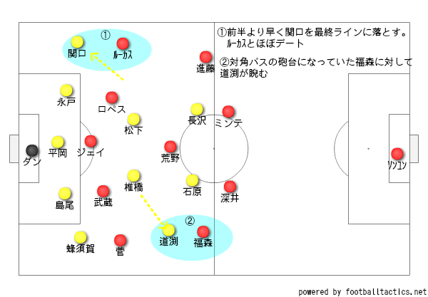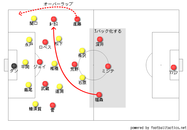 SBをSHが引き出し、その裏に2トップが落ちてくる。