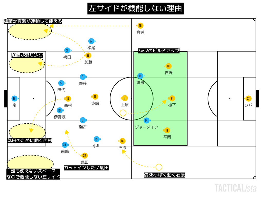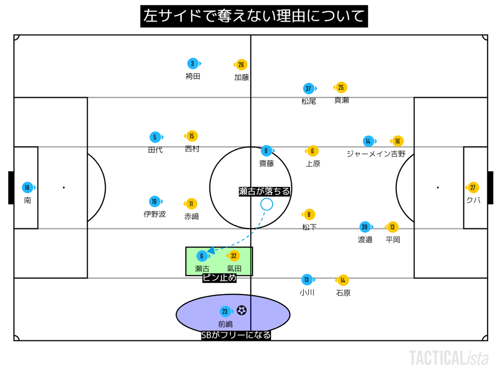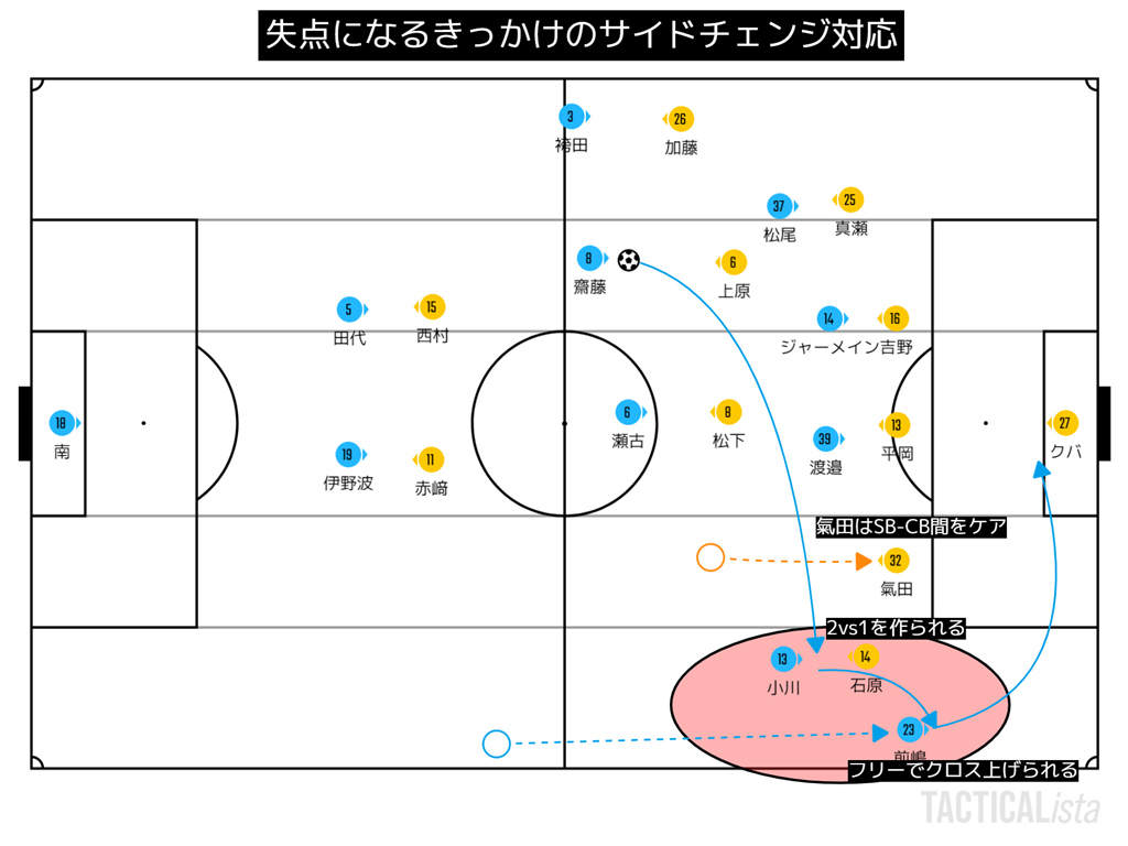 横浜FC戦でも、この逆サイドチェンジからしていたため修正が試された場面だったが、