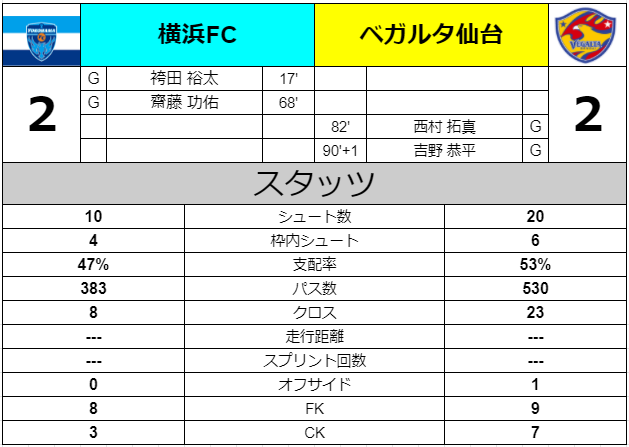 横浜FC戦は2点ビハインドを追いついて