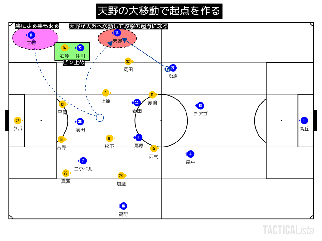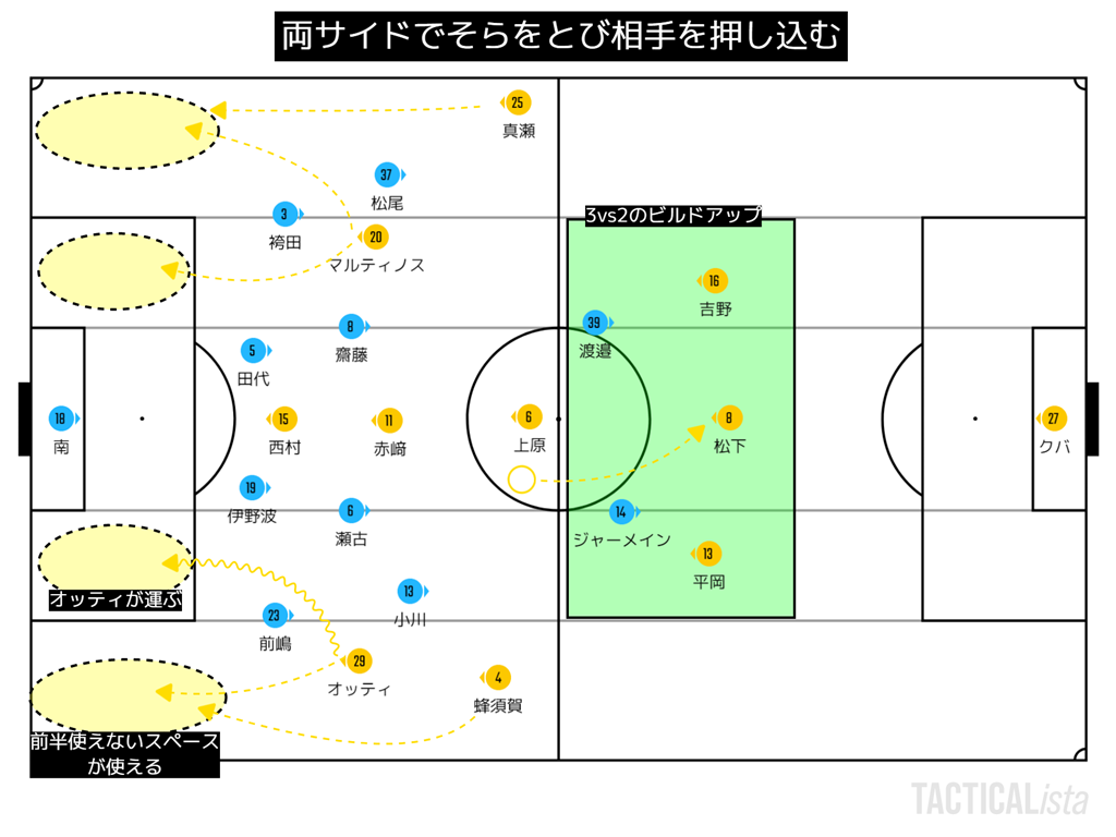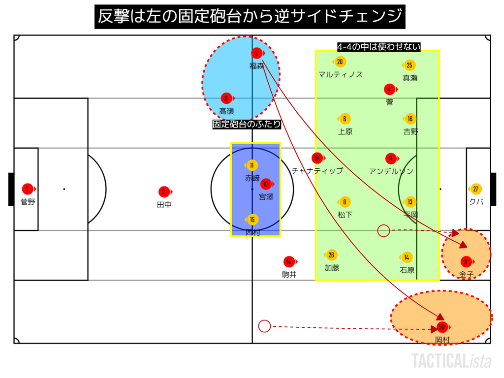 左サイドに高嶺と福森を配置し、そこを固定砲台とし、逆サイドにロングボールを送り、
