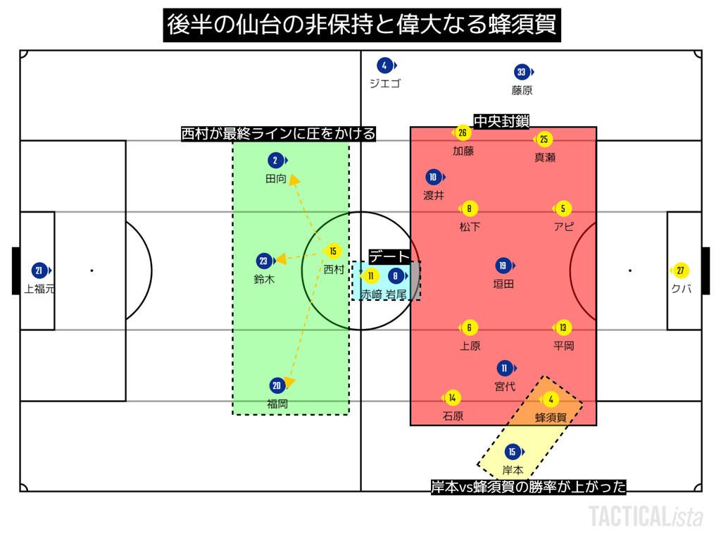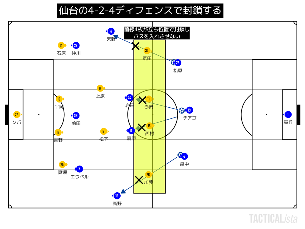 それでも、4-4のブロックがしっかりしていれば仙台は失点しないよ。と言えるはずだった。リードしているのでガッチリと構えればOKなのである。