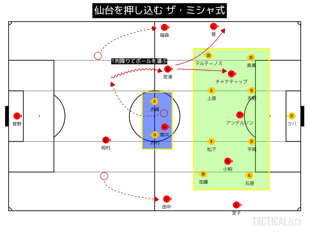 また、宮澤がCBとして入ったということで、そこからボールを運べて仙台を押し込む。