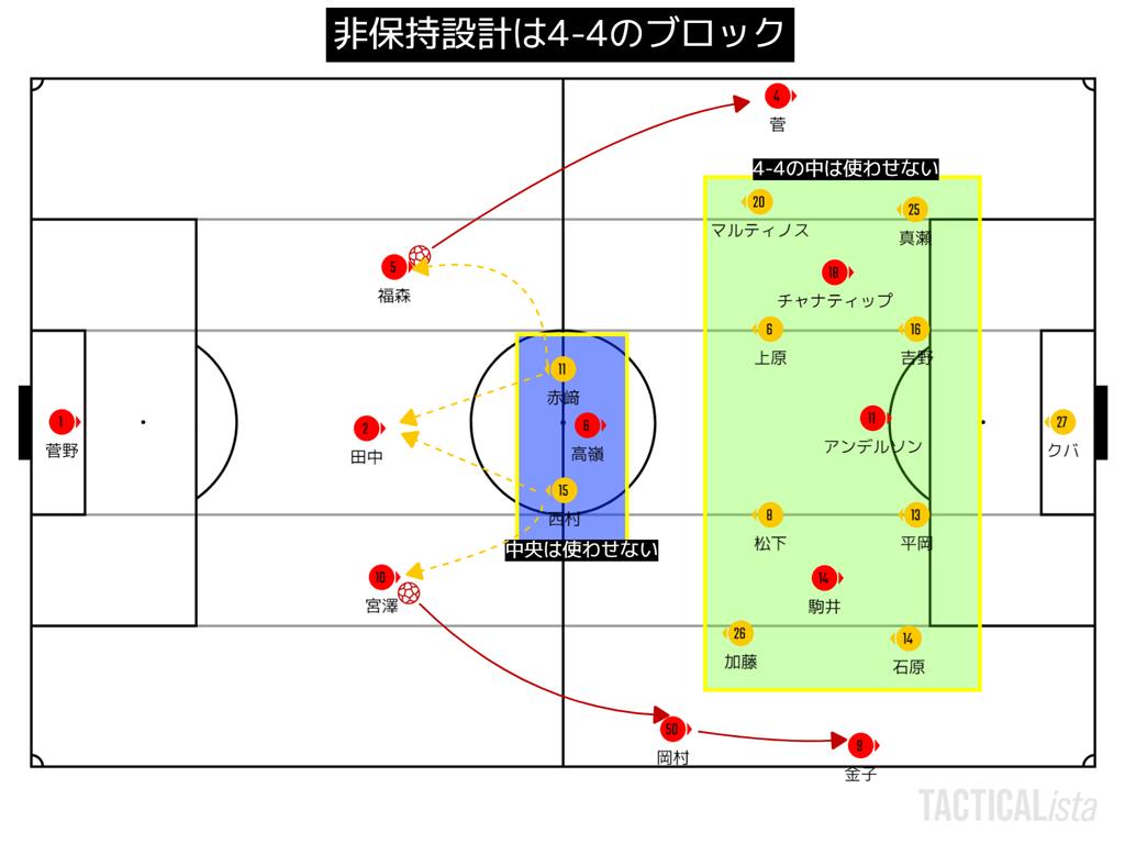 ようするに、トランジションで4-4を作られる前に刺されないようにとロングボールが多めだった。