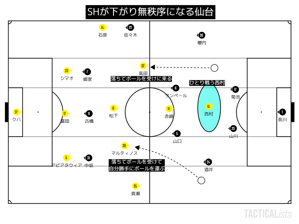 ところで、札幌のこの攻撃で仙台は押し込まれてペナ付近で守ることが多くなり、2トップが孤立。