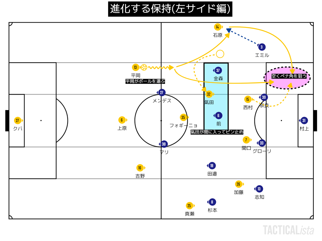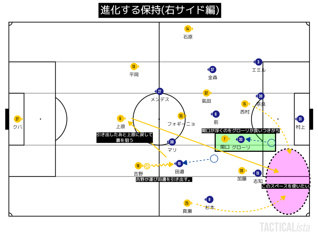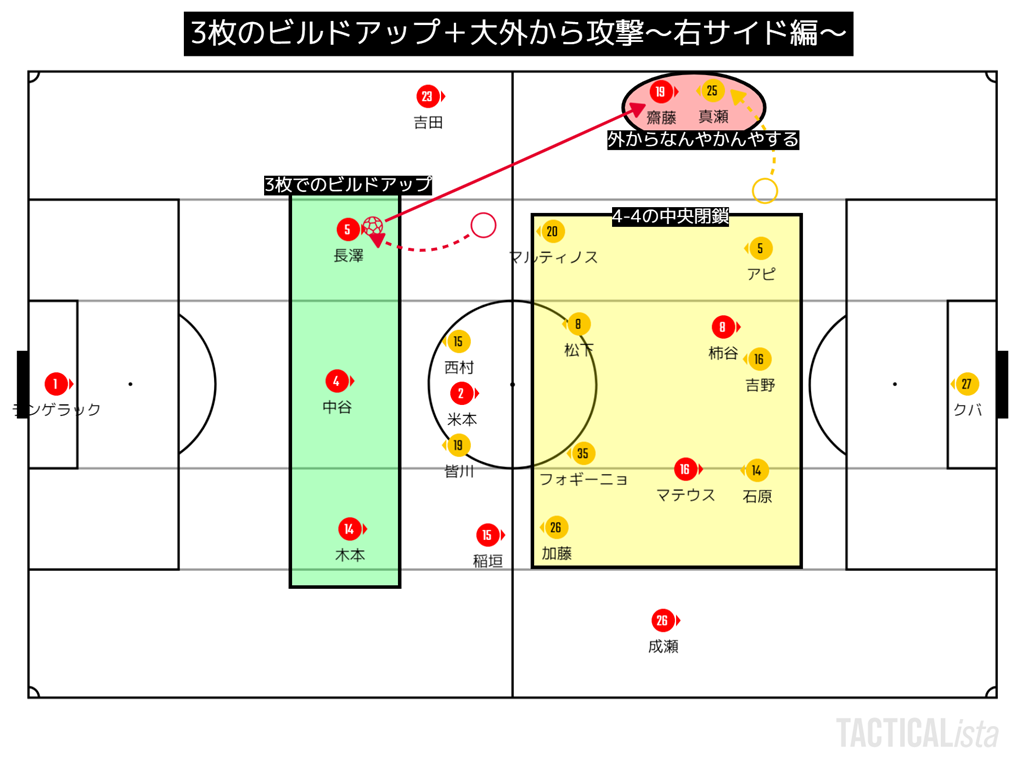 右にボールがある場合、加藤はそこまで中に絞らないのでたぶんチームの狙いというよりもマルティノス個人の判断だと思っている。