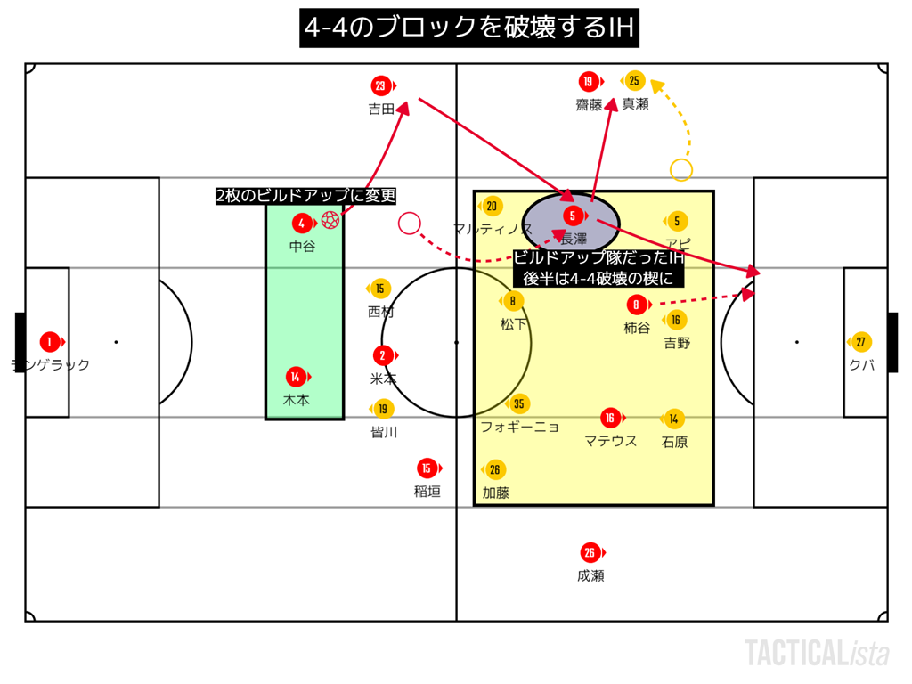 前半はビルドアップ隊であったIHだけれども、後半はビルドアップはCB2枚で実施に変更。