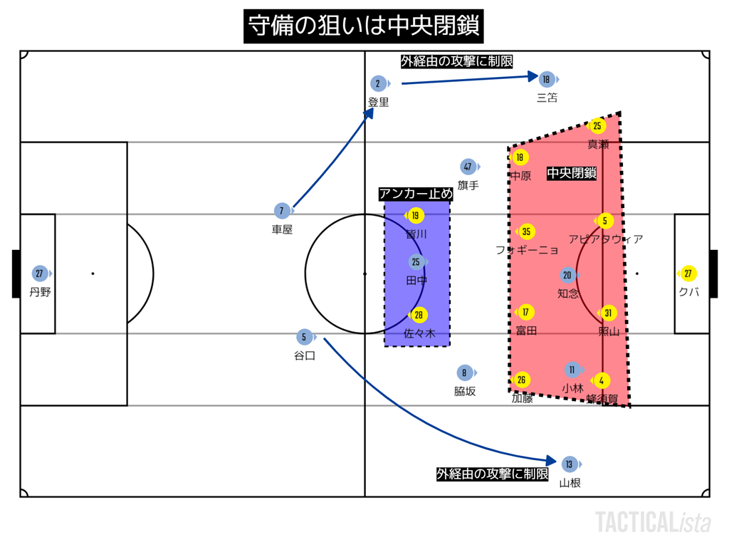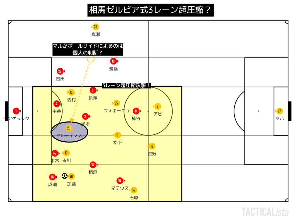 そのために3レーンでの超圧縮。まさに相馬ゼルビア式4-4-2になっていた。