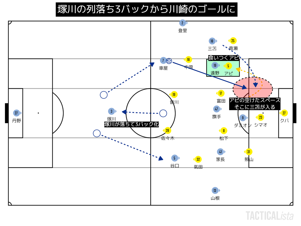 IHが1枚下がって、CB+IHの3枚でビルドアップをする。