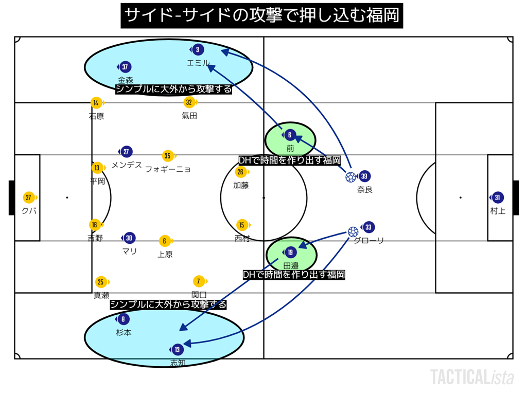そして、ウイングや1列上がったSBにボールを預けてなんやかんやしようぜ。みたいな感じ。