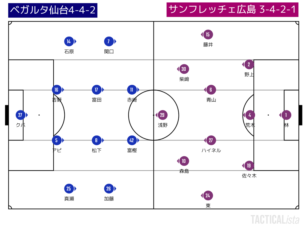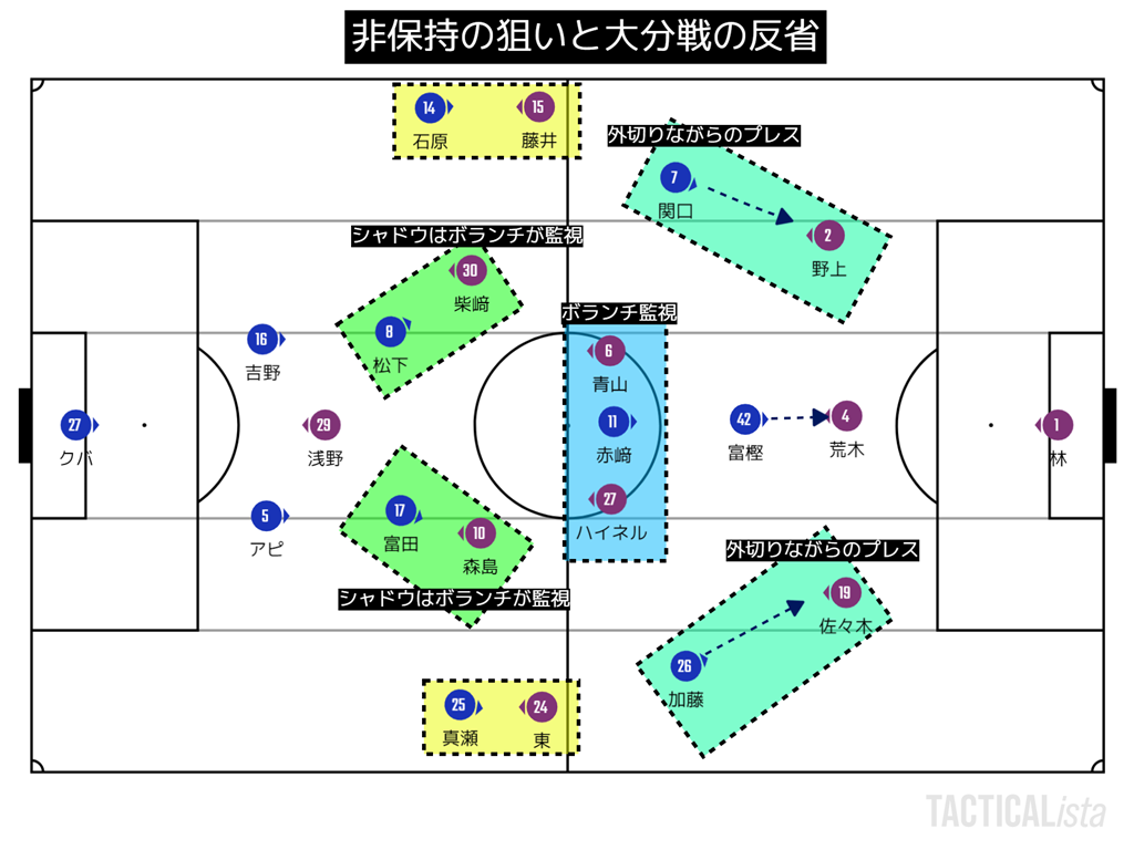 非保持は基本的には大分戦と同じ考え方で戦うのだけれども、トップがカルドソから富樫に変わったことで広島の最終ラインにきっちりと圧を掛けられるようになっていた。