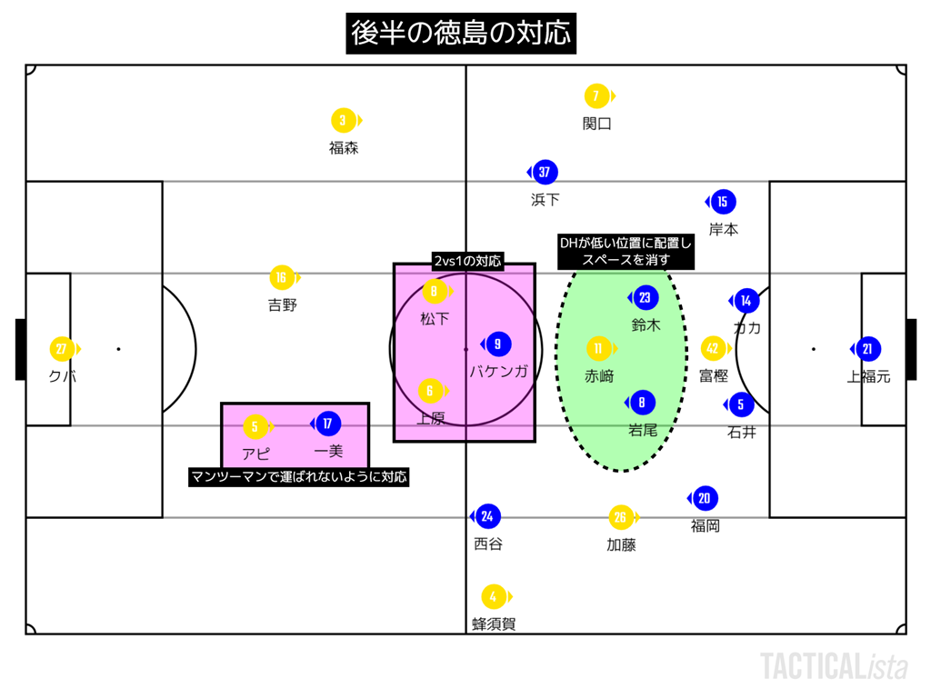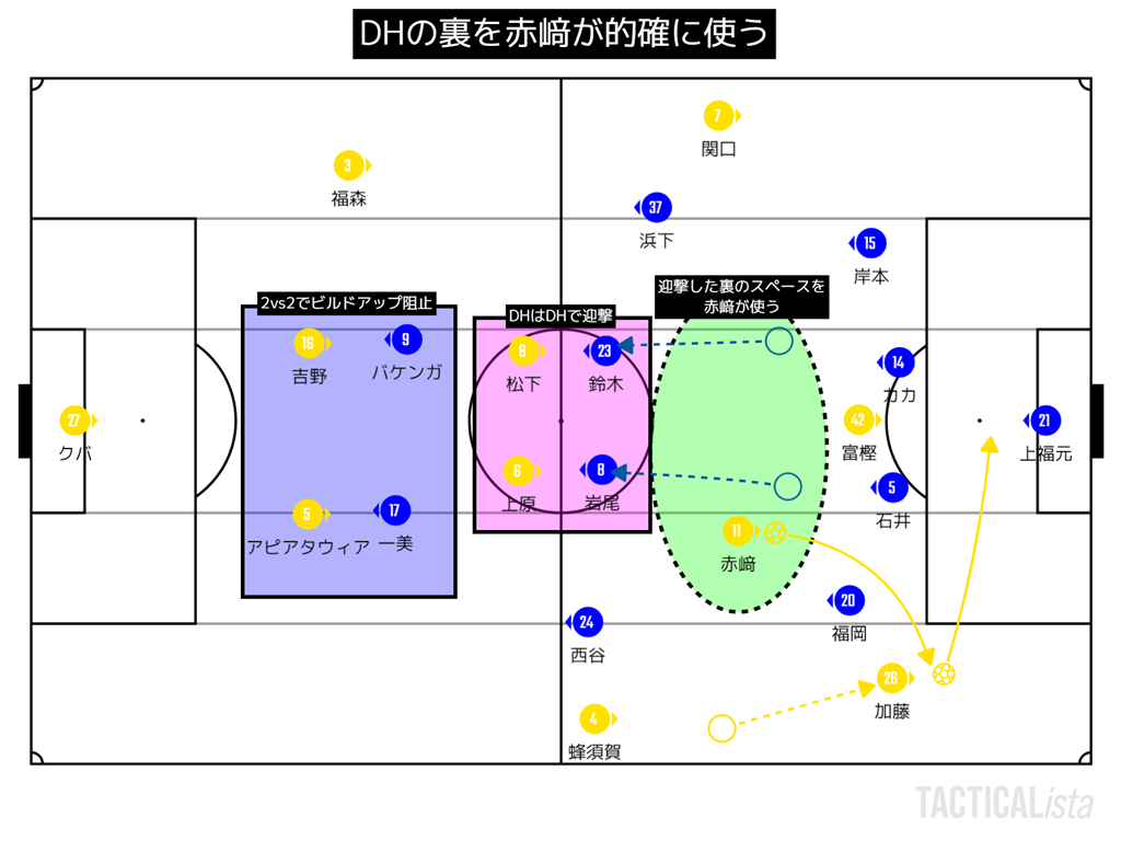 また、赤崎と声を掛けながらパスコースを限定したりと、守備は格段に良くなった印象。