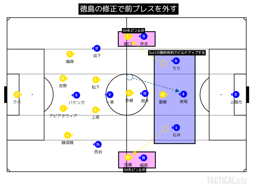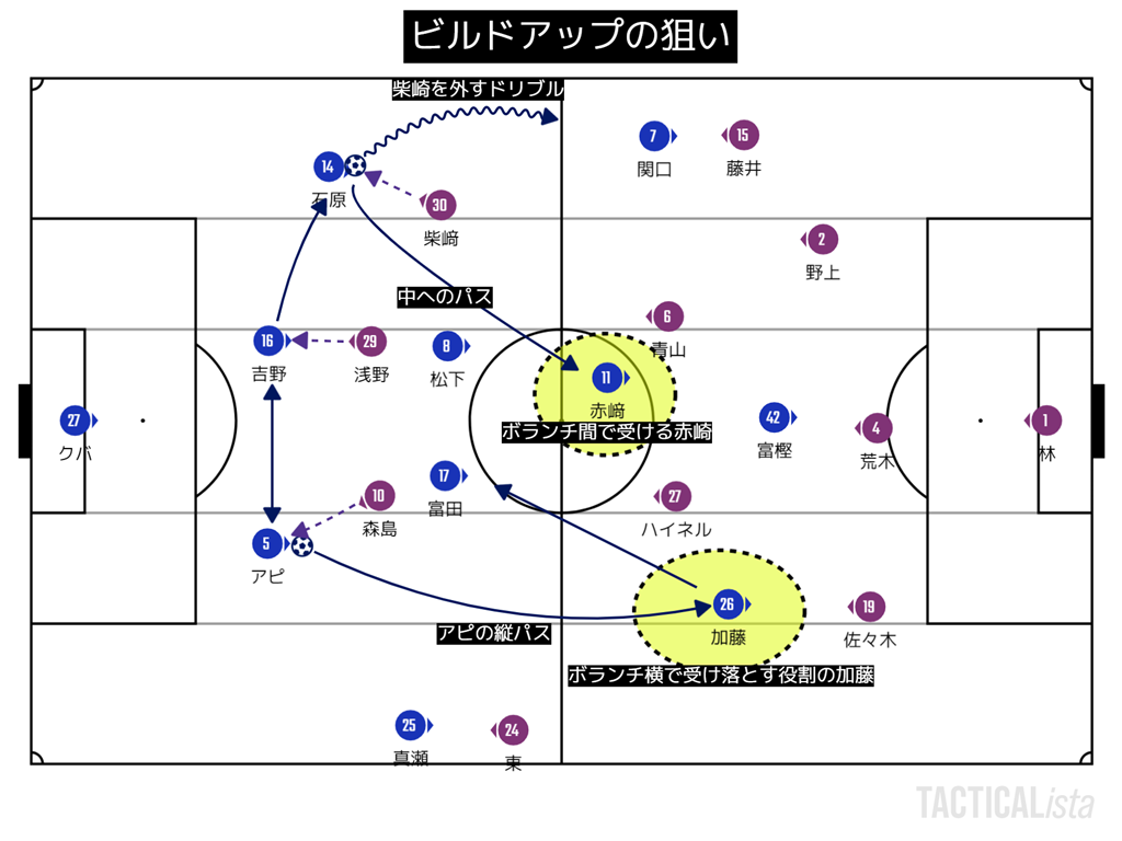 基本的にこの試合ボランチを赤﨑がピン止めする形になっているので、ボランチ脇が空いていて、そこを加藤が使う。