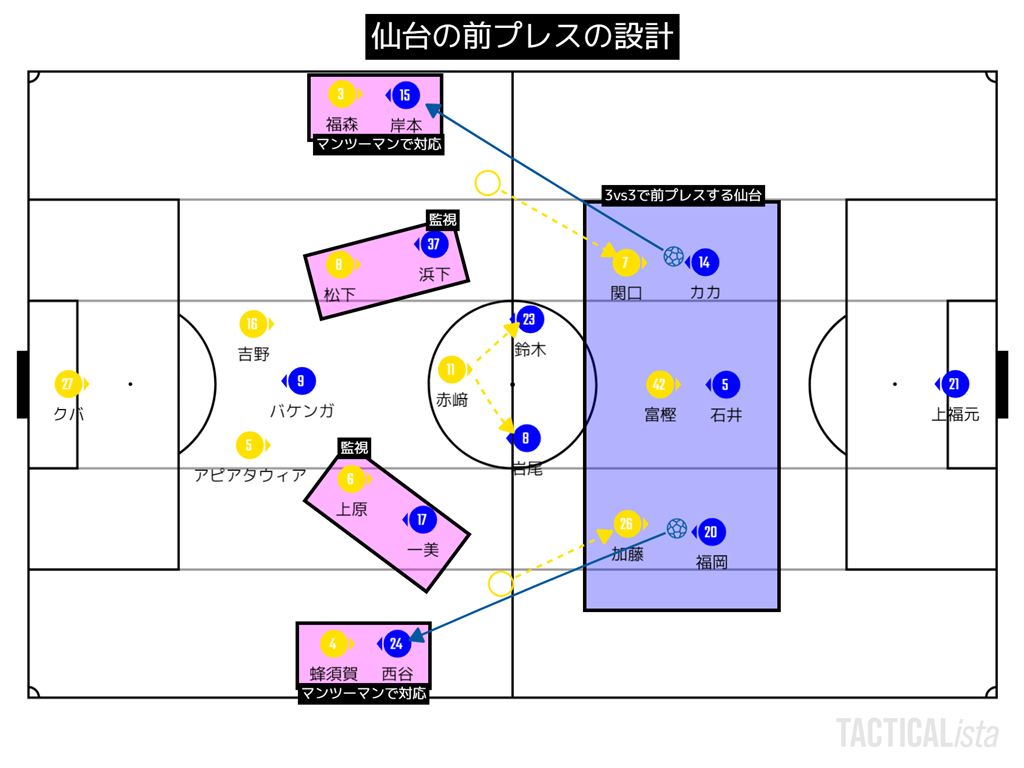 アピの縦パスを加藤に入れる事が出来て、そこからSBorDHに展開して仙台がボール保持でコントロールする事が出来た。