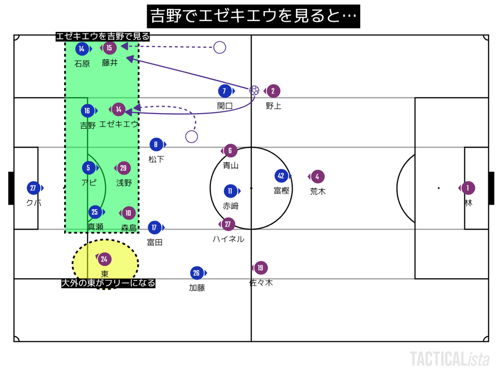 ただ、そうした場合に大外の東がフリーになる。これを利用されたのが、49分の決定機。