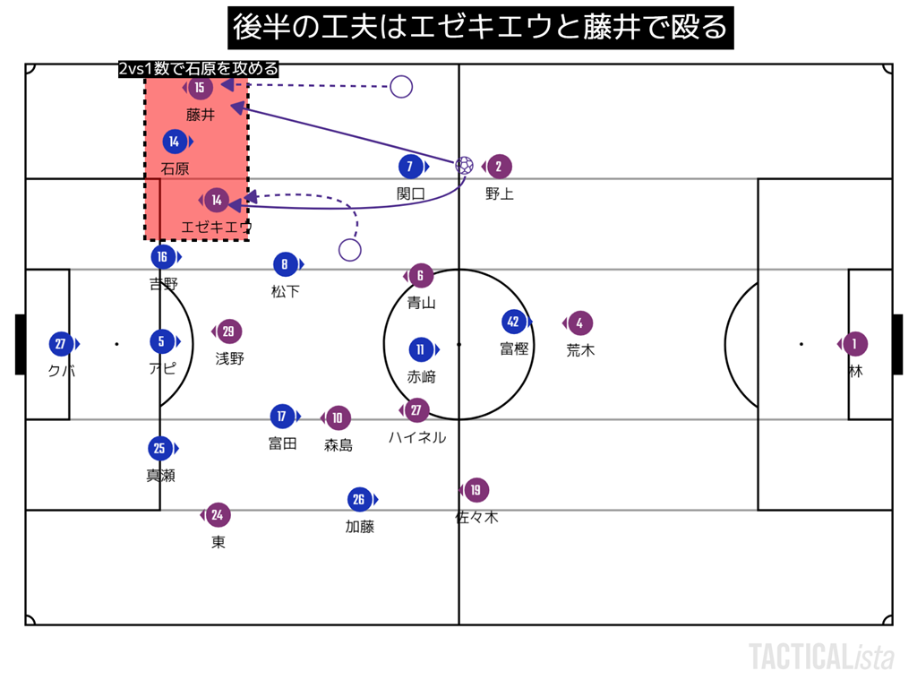 左サイドは石原が入った事で中のパスと外へドリブル。と2つの選択を常に持てた事が大きかった。藤井、柴崎のプレスをこの2つの選択で外しボールを運んでいった。
