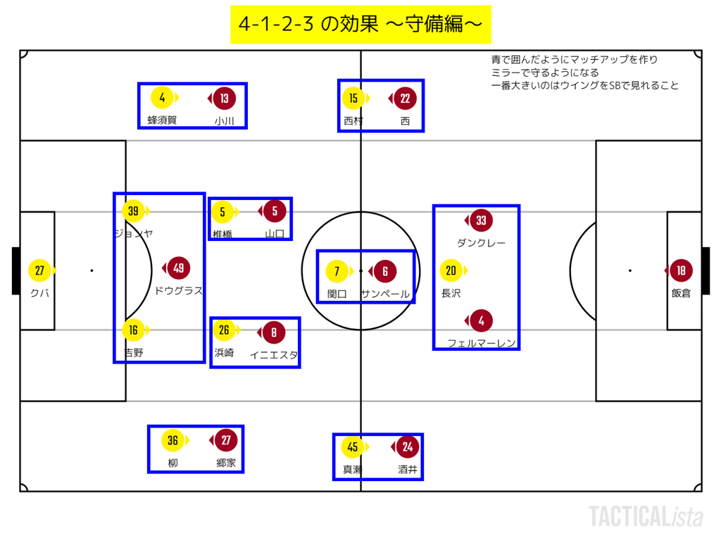 WBにはSBが対応し、イニエスタは浜崎がマンツーマン的につく。