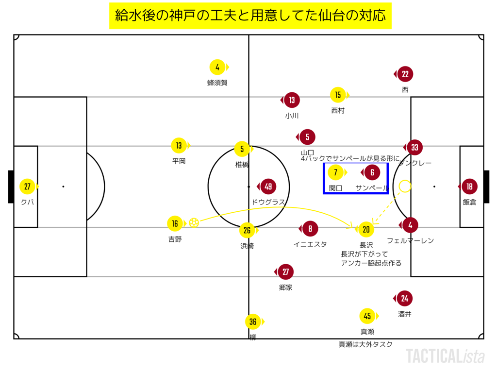 さて、そんな話を挟んでの給水タイムの話。神戸は前プレスの的になっていたサンペールを一列上げて4-1-2-3の形に戻す。