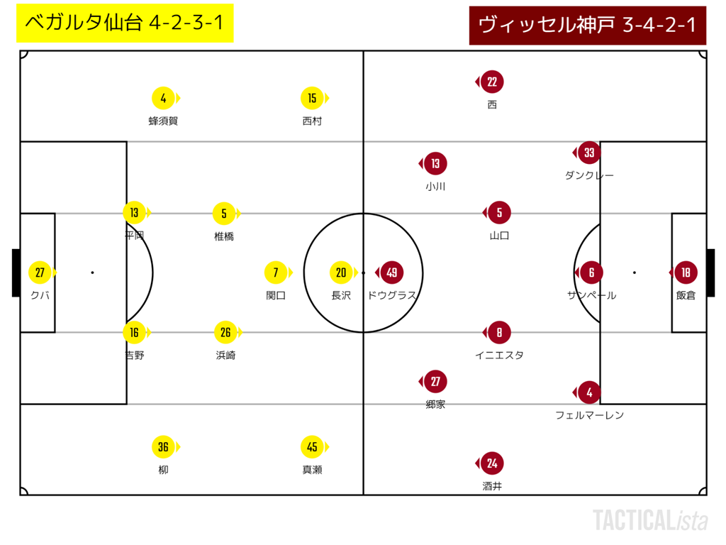神戸は前節の札幌戦で上手くいったためか、このゲームも3バックを採用。ただし、この3バックが仙台は嵌めやすかったように見える。