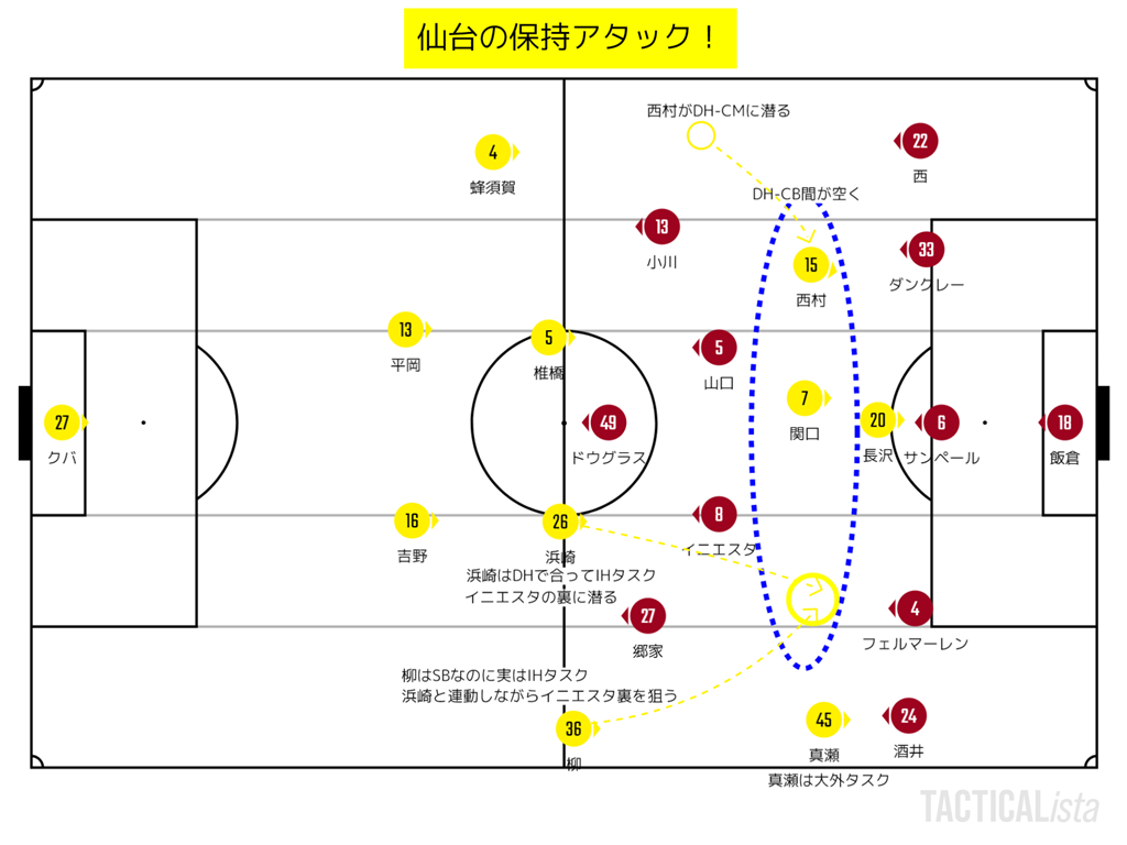 さらに、仙台は保持アタックでも優位に立つ。狙いは間延びしているDH-CB間。