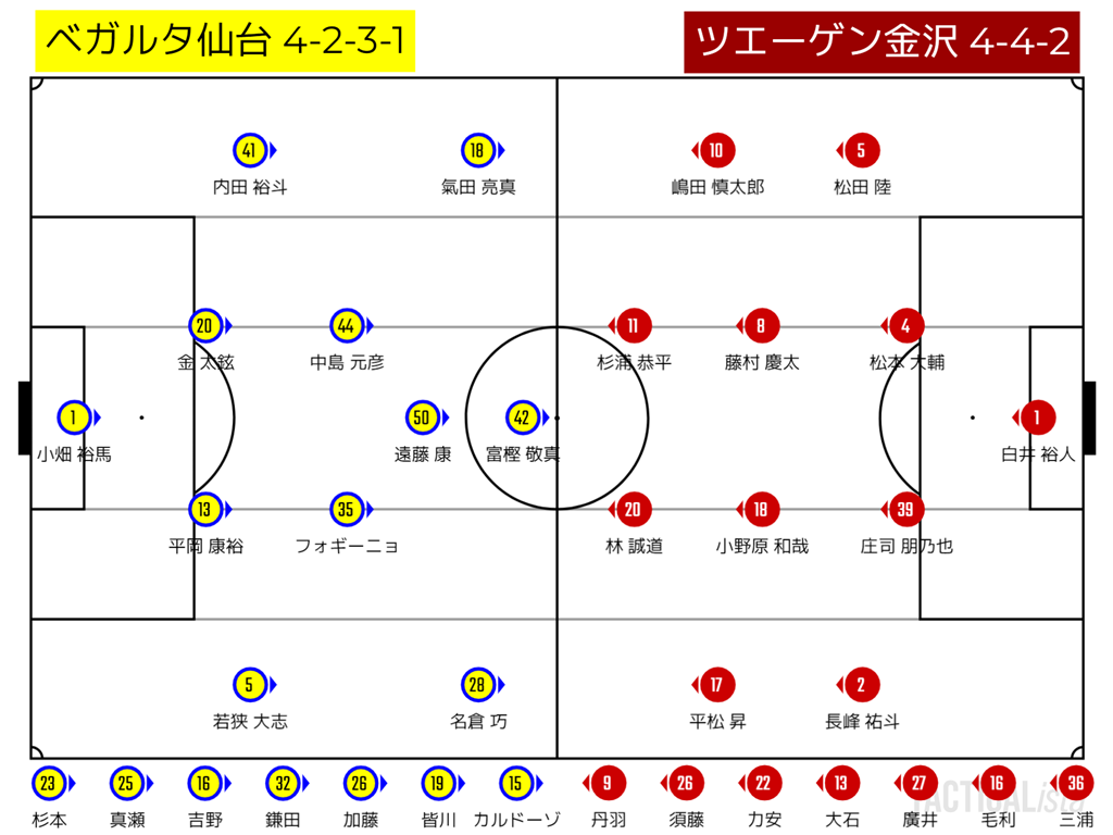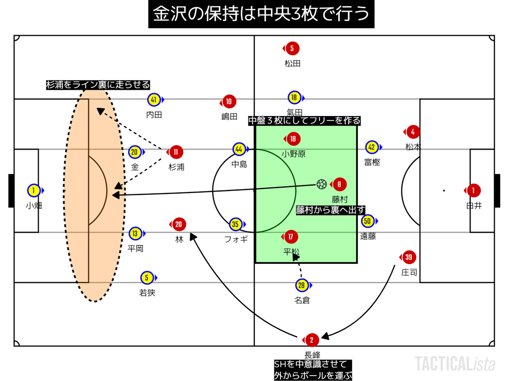 金沢の保持は4-4-2から藤村アンカーで左サイドハーフの平松とボランチの小野原が