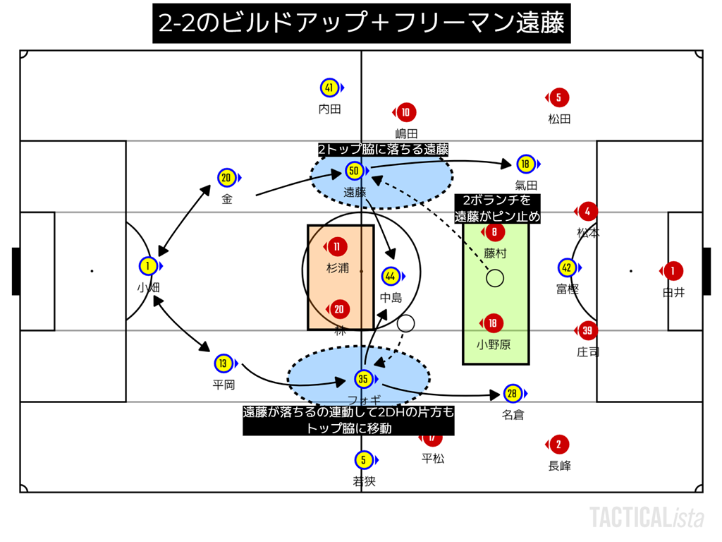 - 3-1.2-2でのビルドアップと遠藤のサポートで前進する