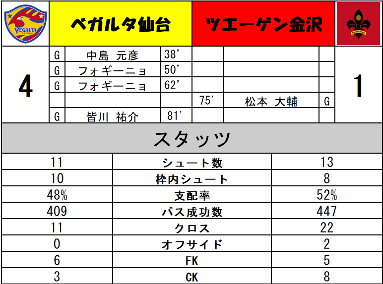 ただ、その展開を壊すように38分に中島が見事なFKを突き刺し仙台が先制し、ほぼ互角な展開であったのに仙台が先手を取って前半を終える。