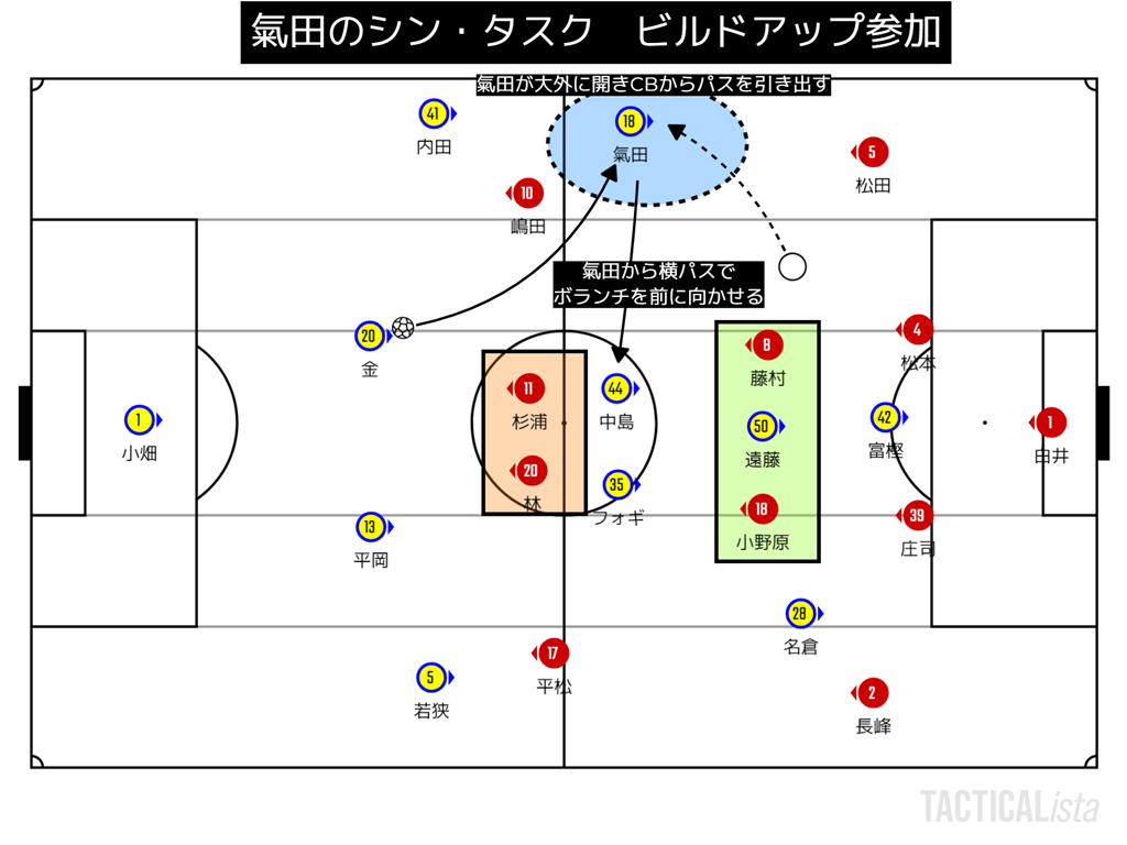 最終ライン攻略のところはもしかしたらまだ氣田がビルドアップから最後の崩しのところで自由になることができなかったのかなーと思う。