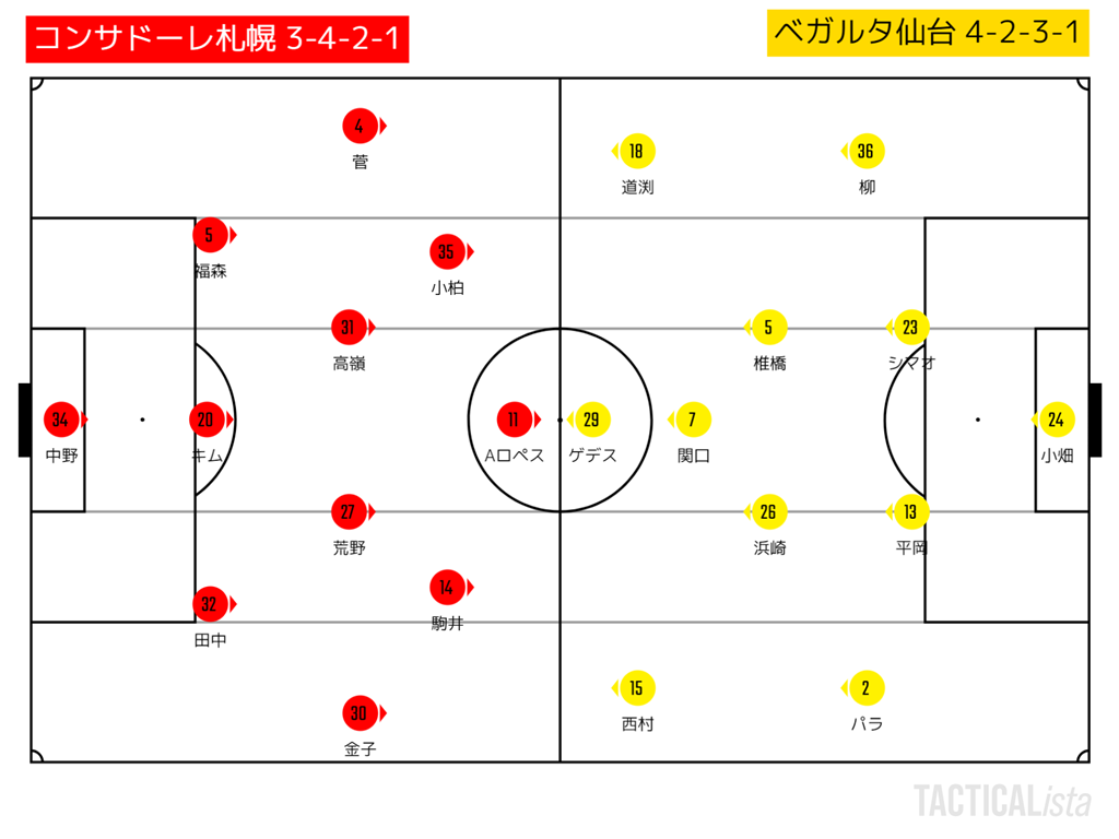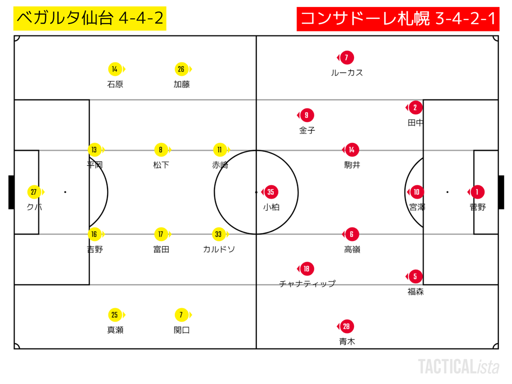 仙台は4-4-2のブロックで、札幌は4-1-5の保持。