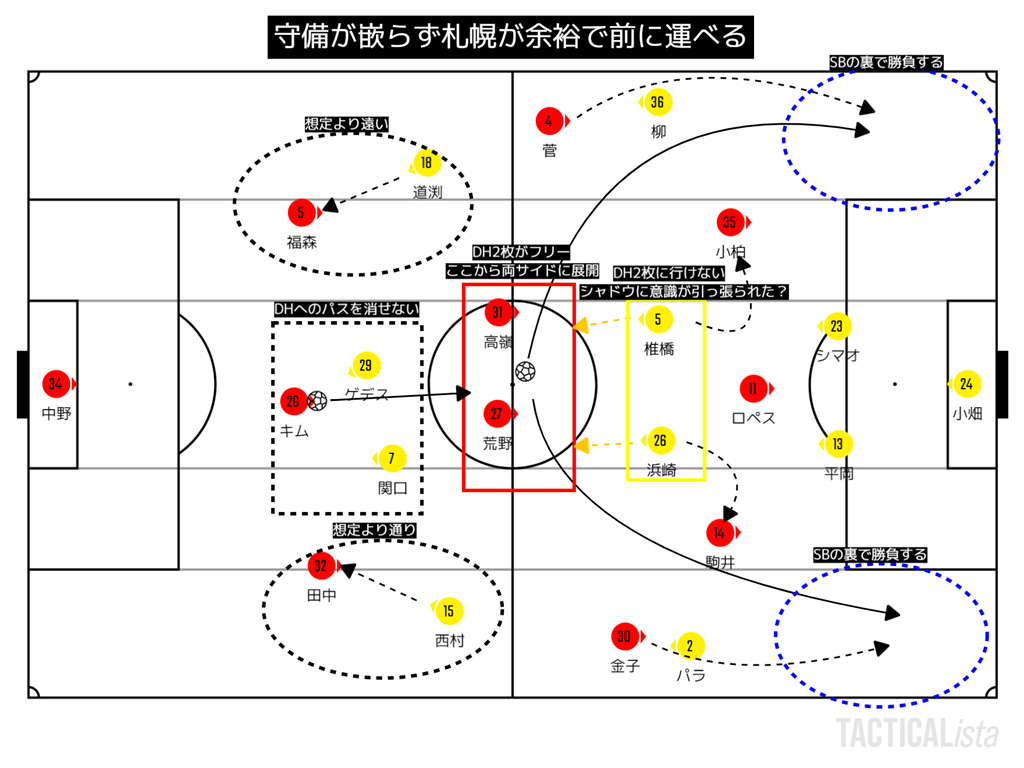 ただし、マンツーマンで守る札幌に対して保持が出来ずクリアしても、攻撃に移れず札幌が再びボール保持する。という状態が続く。