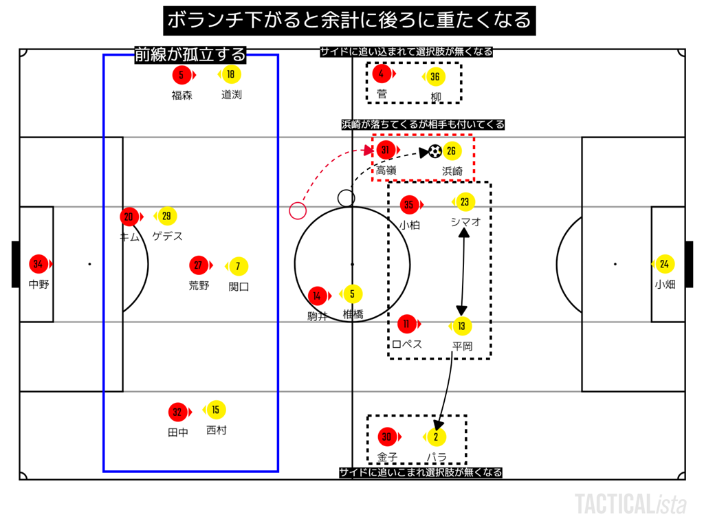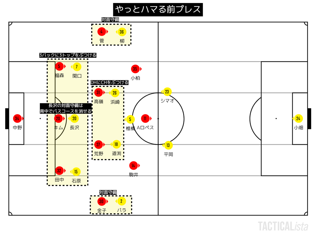初先発のカルドソが非保持で全然機能せず、高嶺を捕まえられないのは想定外だったのだと思う。