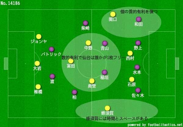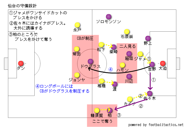 最終ラインの5と中盤の4の距離感が抜群に良く、仙台はこの間ではほとんどキープ出来なかった。