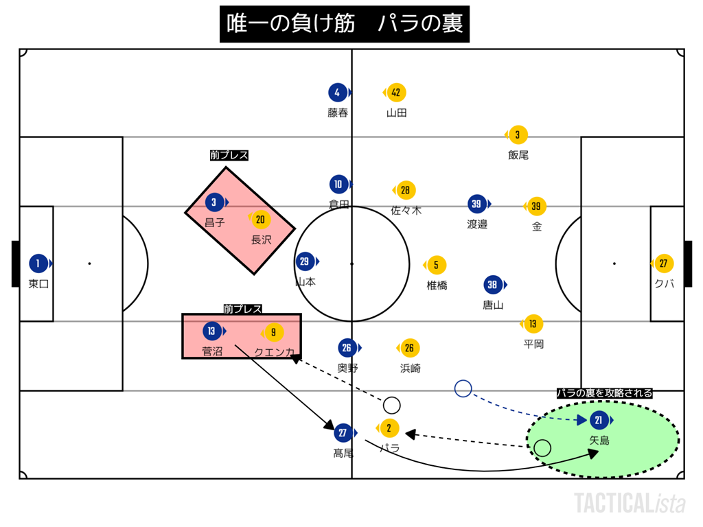 それは、前プレスかけたときに原川のところで前プレスを外され、空転していたためである。
