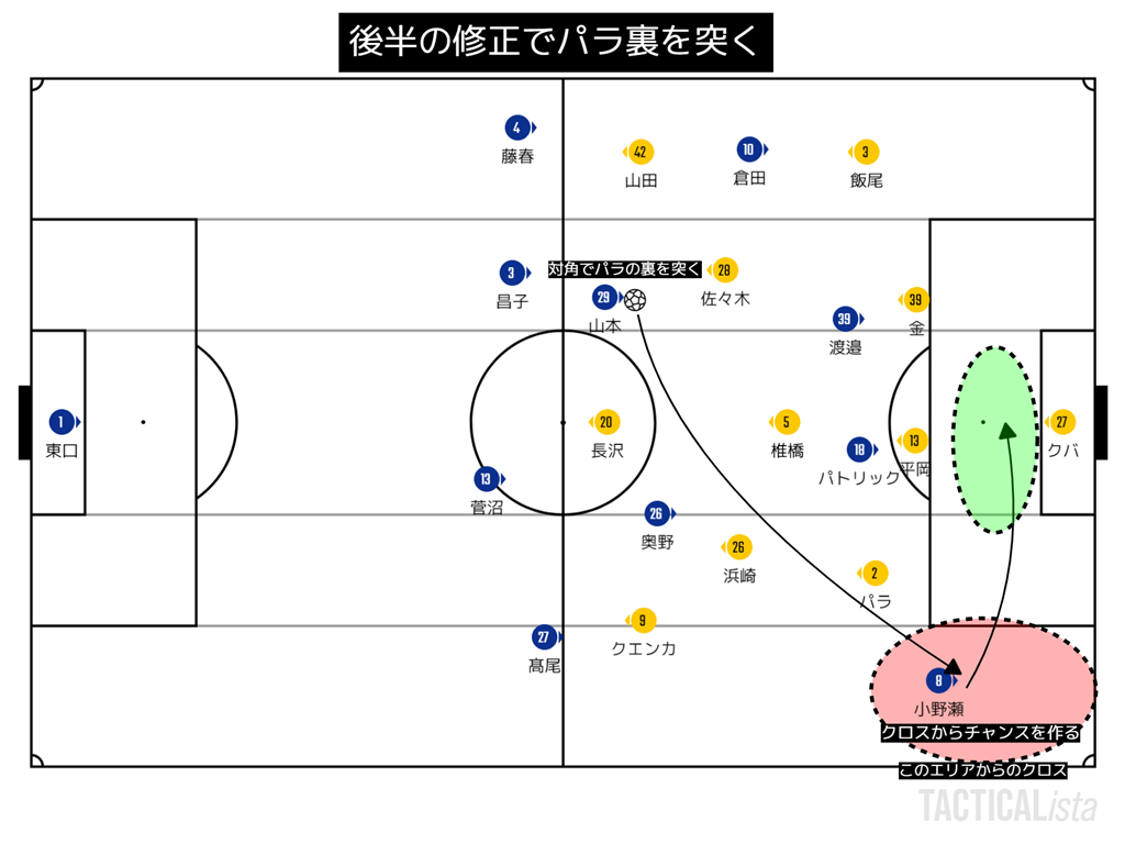 これで、鳥栖は前半ほど中央を使えず、外外への攻撃へシフトしていく。