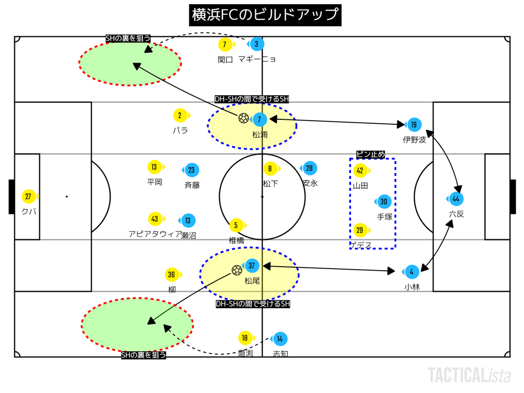 また、横浜FCは対角のパスを利用しWBのウイング化からクロスを狙うのだが、