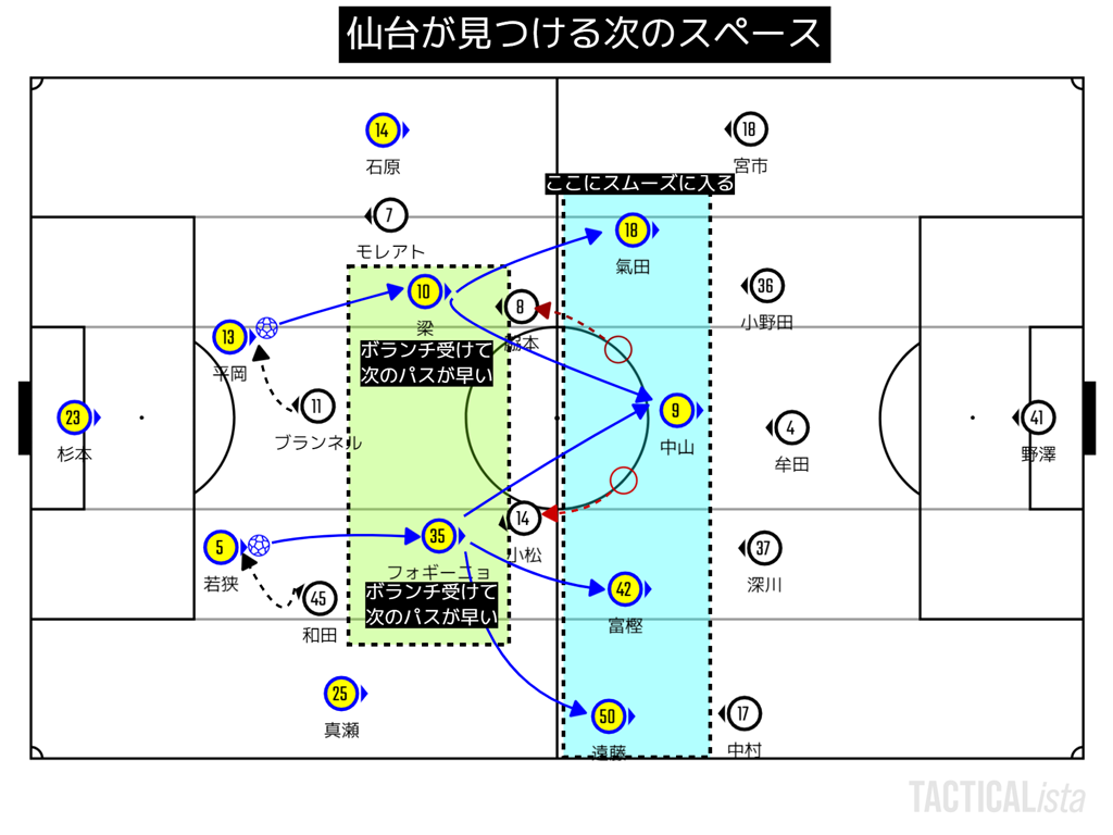 それに対して仙台は氣田を前に残し、2トップ+氣田で3vs3にしていた。