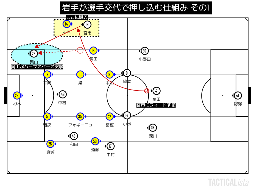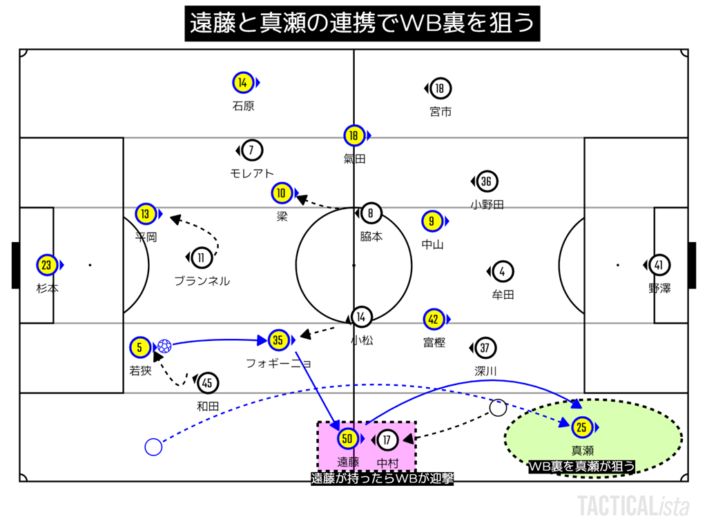 前節まではサイドチェンジから縦に刺す事が多かったがこの試合はこのシーンが初めてだった。