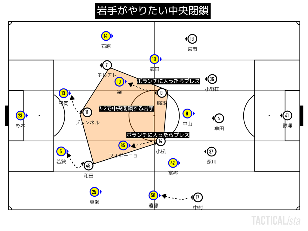 岩手は5-4-1で撤退するわけではなく5-2-3で中央閉鎖して仙台にボールを持たせない事を選択した岩手