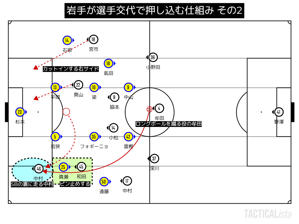 また、トップに入った中村は左サイドに流れ、和田-真瀬の所の裏を狙う事で奥を取る事に成功した。